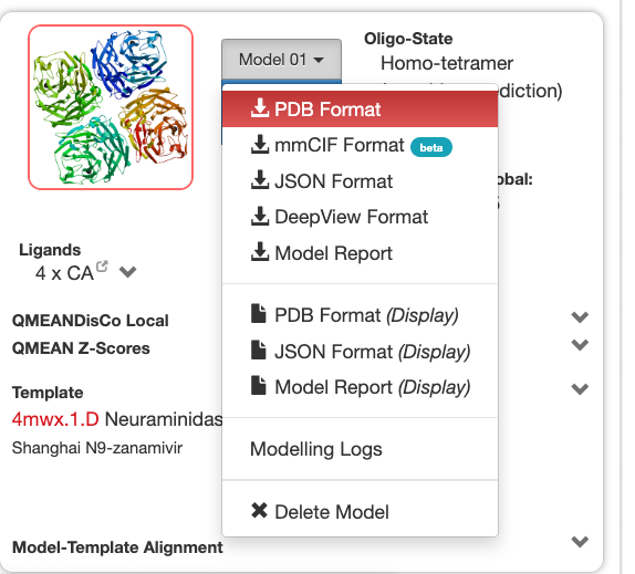 - Check the target-template alignment and the model quality (Structure Assessment blue button).