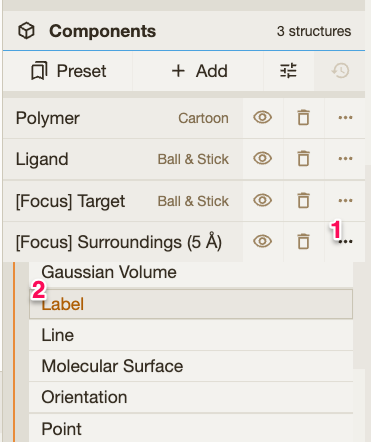 🪄 Trick: Click on the drug molecule and then use the right menu to change anything in the representation of the surrounding environment of the drug. For instance, you can add labels using Then click in the Do it for one monomer in each structure to see the differences in the binding pocket. |