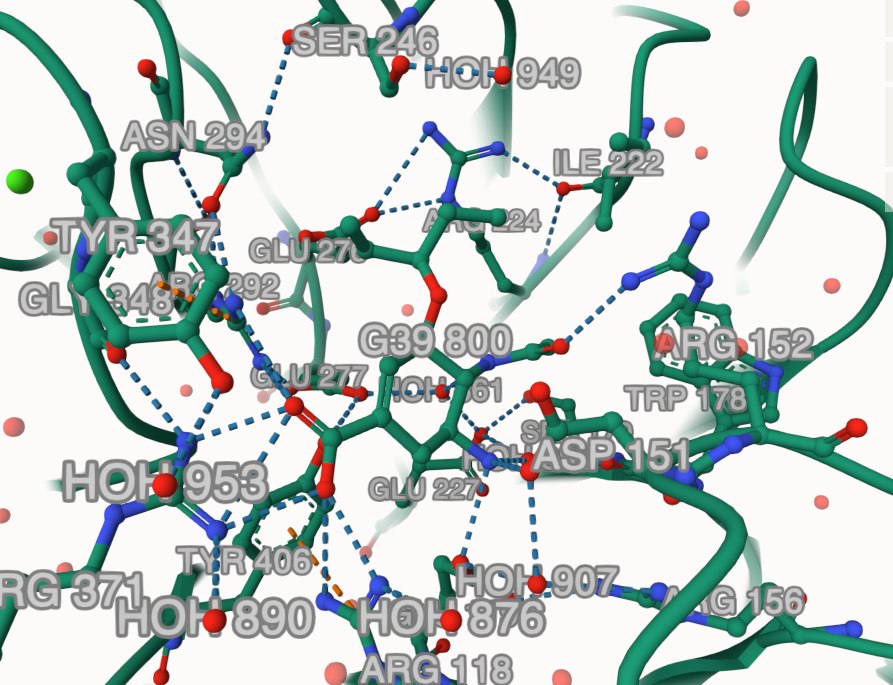 Zoom-in on the structures and see how each protein interacts with the inhibitor. Just move the mouse pointer over each residue and you will easily identify them by a label on the bottom-right corner. 💡 Tips: